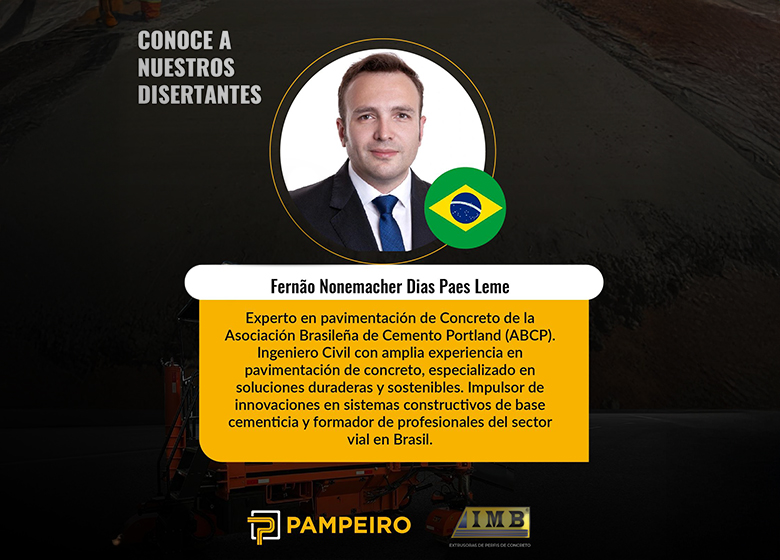 - Fernão Nonemacher Dias Paes Leme - ABCP: Coordinador en Pavimentación en la Asociación Brasileña de Cemento Portland (ABCP). Ingeniero Civil con una amplia trayectoria en pavimentación de concreto, especializado en soluciones duraderas y sostenibles. Su labor ha sido clave para el desarrollo de innovaciones en sistemas constructivos de base cementicia y en la formación de profesionales del sector vial en Brasil.