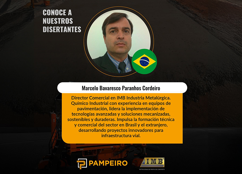 - Marcelo Bavaresco Paranhos Cordeiro . IMB: Director Comercial en IMB Industria Metalúrgica y Químico Industrial con una vasta experiencia en equipos de pavimentación. Su enfoque en tecnologías mecanizadas y sostenibles ha impulsado proyectos innovadores en Brasil y el extranjero, liderando el desarrollo técnico y comercial del sector vial.
