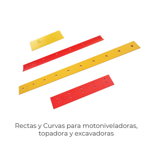 - Rectas y curvas para motoniveladoras, topadora y excavadoras: Recomendadas cuando el material es abrasivo y suelto. Para trabajos que requieran una alta resistencia al impacto y donde la penetración en el suelo no sea el requisito principal.