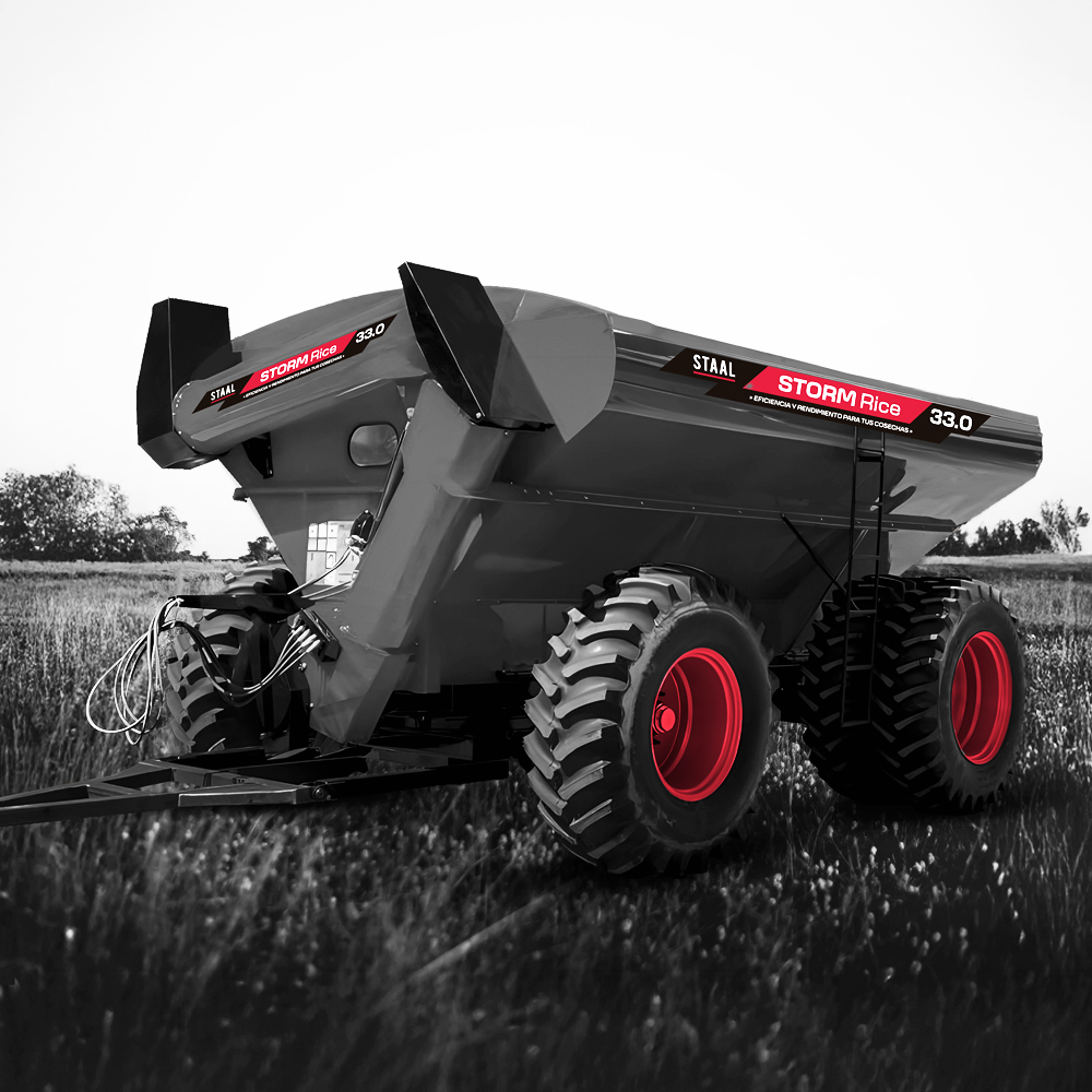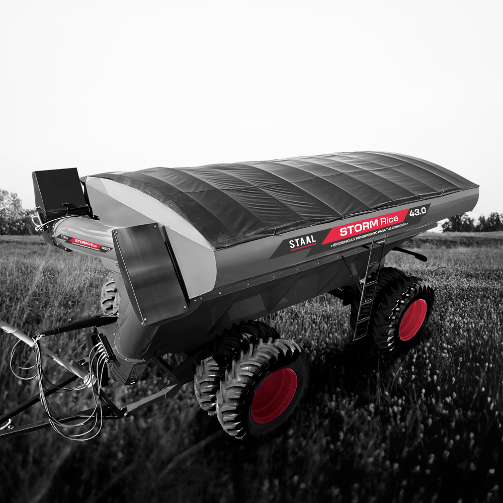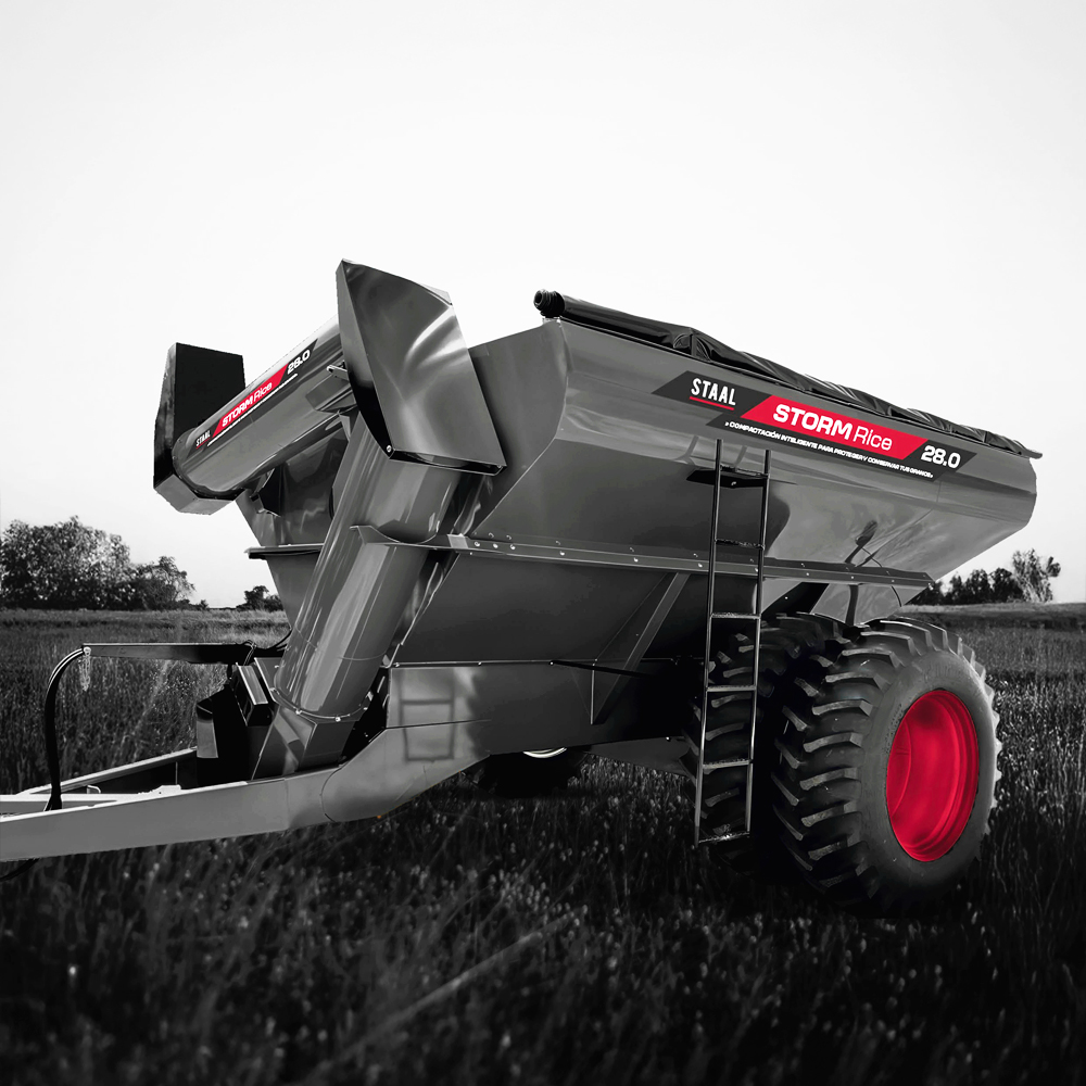 As carretas graneleiras STORM Rice de STAAL, equipadas com tubos frontais, são a solução ideal para trabalhar em conjunto com as colheitadeiras, facilitando a colheita ágil e segura de cereais a granel, como arroz, soja, trigo e milho. Oferecemos 4 modelos com capacidades que variam de 21.500 a 43.000 litros, disponíveis com tubos de 480 e 530 mm, e configurações de um ou dois eixos.